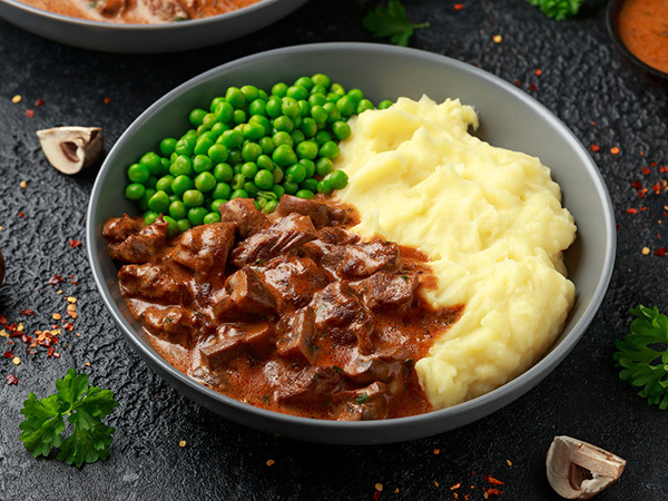 Köttgryta med potatismos och gröna ärtor